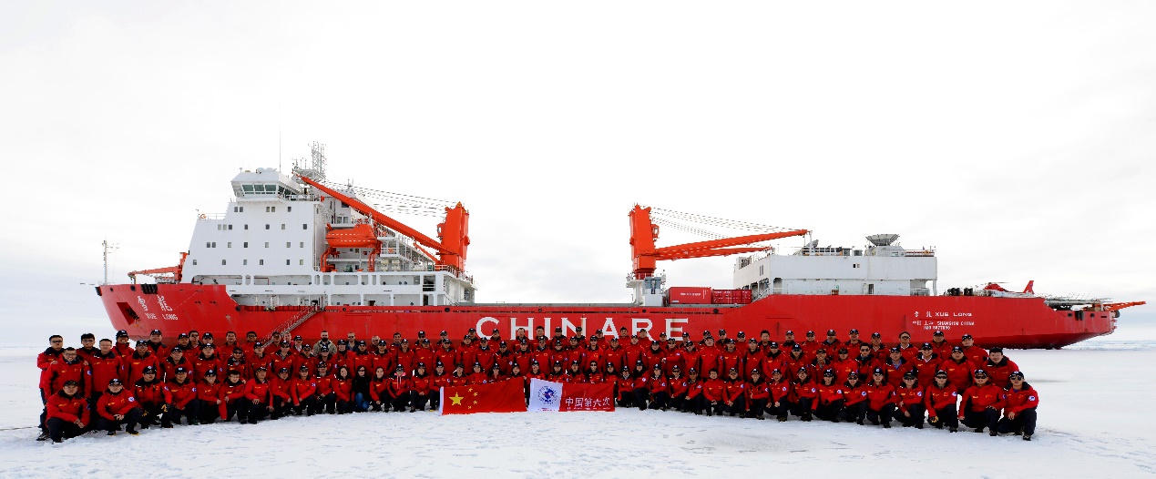 上图:冰上的大合影成为每次北极考察的保留曲目,通常会选择一个相对安全的厚冰上进行。除了留少数人员值守外,其余人员下船列队拍照一气呵成。