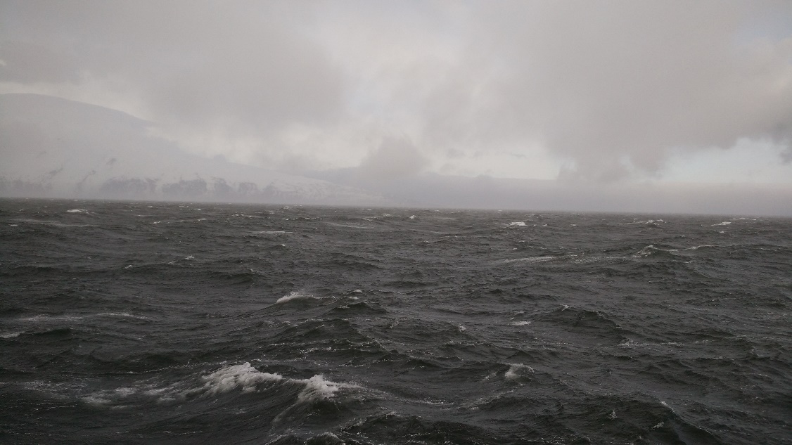 上图(夏骏摄):作业接近扬马延岛时遭遇低压气旋,船体摇摆剧烈人员站立不稳,风浪破碎后的飞沫贴着海面“飞行”,图片中远处为神秘的扬马延岛,犹如一艘战舰孤独地矗立在北欧海的中央位置,因为特殊的地理和气候条件,这里常年海况恶劣,又恰恰处于北极锋区,冷暖两支性质迥然的水体(大西洋暖流和格陵兰寒流)在这里会发生显著混合。
