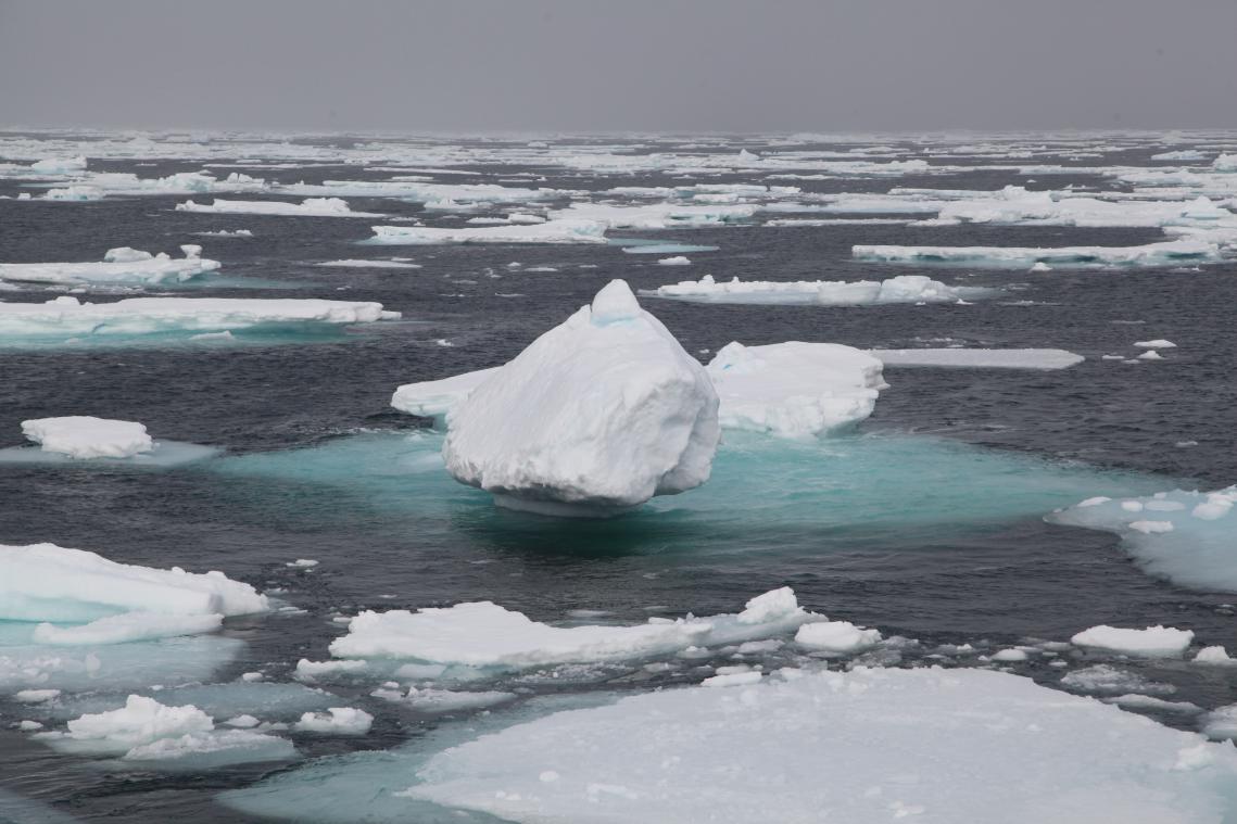 上图(鲁建林摄):6月9日接近格陵兰岛陆坡时遭遇海面的浮冰带,今年浮冰分布区域比预计要广,该船只尽管有一定抗冰能力但是破冰能力非常弱,在冰区航速只有3-4节,为防止被海冰围困以及节省船时,经商定酌情取消之前计划内的位于格陵兰陆坡和陆架上的站点,转而回到海盆区完成潜标布放并前往扬马延岛。