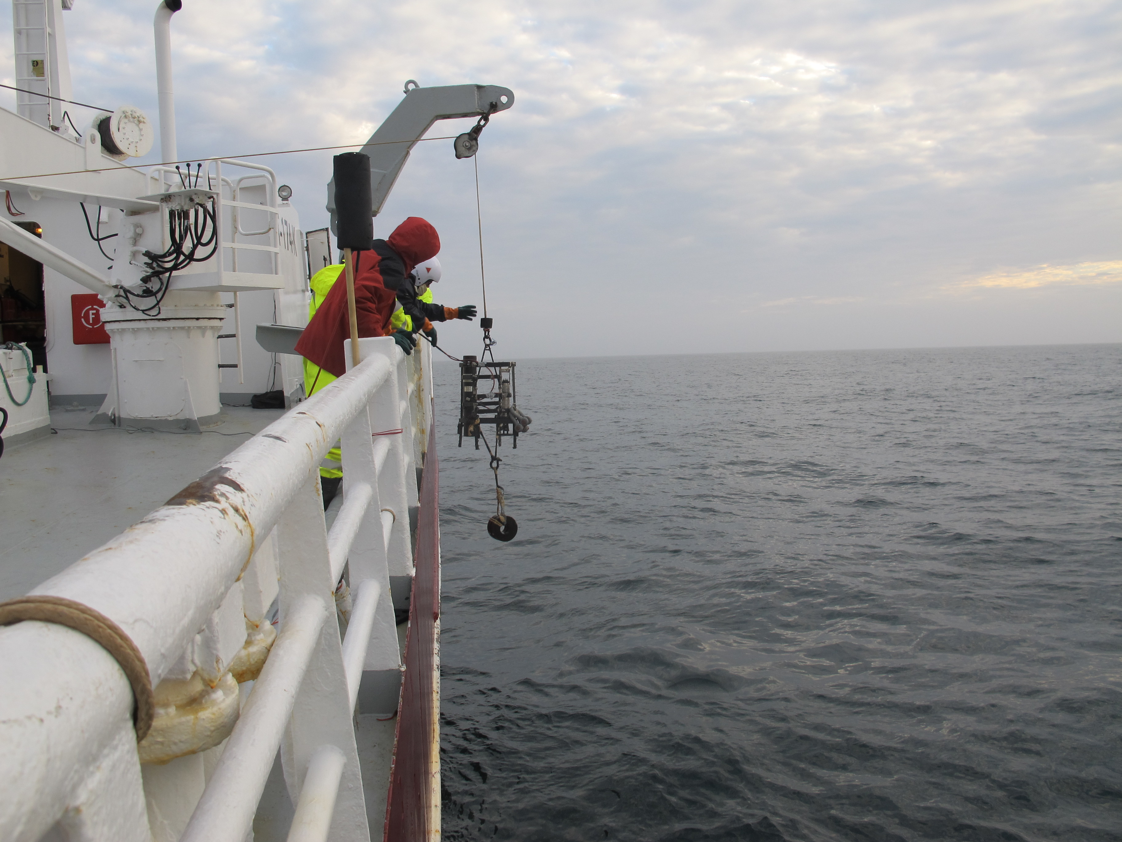 本次考察于莫恩海脊回收2016年6月所布放的深海潜标一套,同时布放2套深海潜标(平均水深3000m)。使用SBE-25CTD设备共完成92个站位的CTD剖面观测,走航观测投放XCTD16个。此外,在北欧海完成63个站位的海洋光学观测,观测参数涉及自海洋表层至110m深度范围内的向下\向上太阳短波辐射强度、海水温度、盐度、荧光叶绿素和浊度剖面。生物-化学组共完成31个关键站点的作业。海雾观测依托架设于船体右舷的微型自动摄像机,获取走航及作业期间的海面云雾影像,主要用于为海雾遥感提供现场验证资料,以及为后续海洋光学分析和研究提供现场环境的参考。