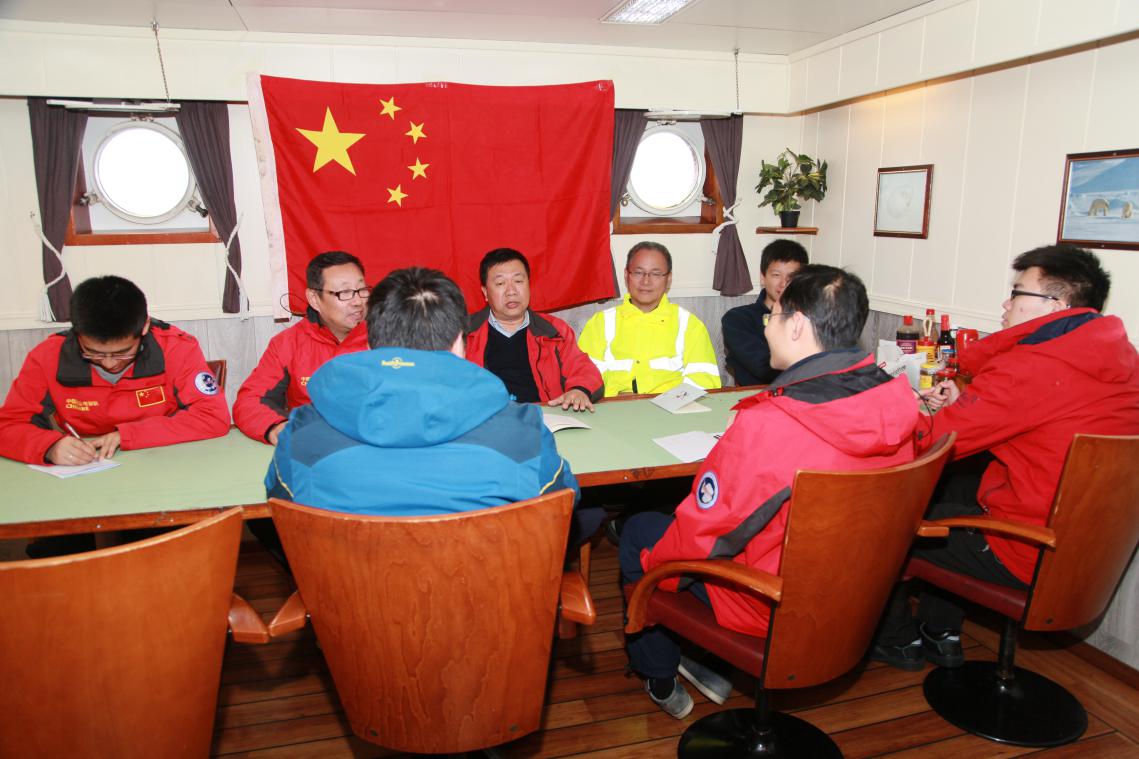 上图(高琳摄):本次16位考察队员中有一半是中国共产党党员,虽然身在遥远的北欧海进行科学考察,但他们仍然牢记自己的党员身份,在矫玉田高工的组织下成立了临时党支部,考察作业间隙,临时党支部开展了党员学习会,总结考察任务、工作,讨论船上学习、生活情况,让各位党员在艰苦的大洋考察工作中感受到组织的温暖。