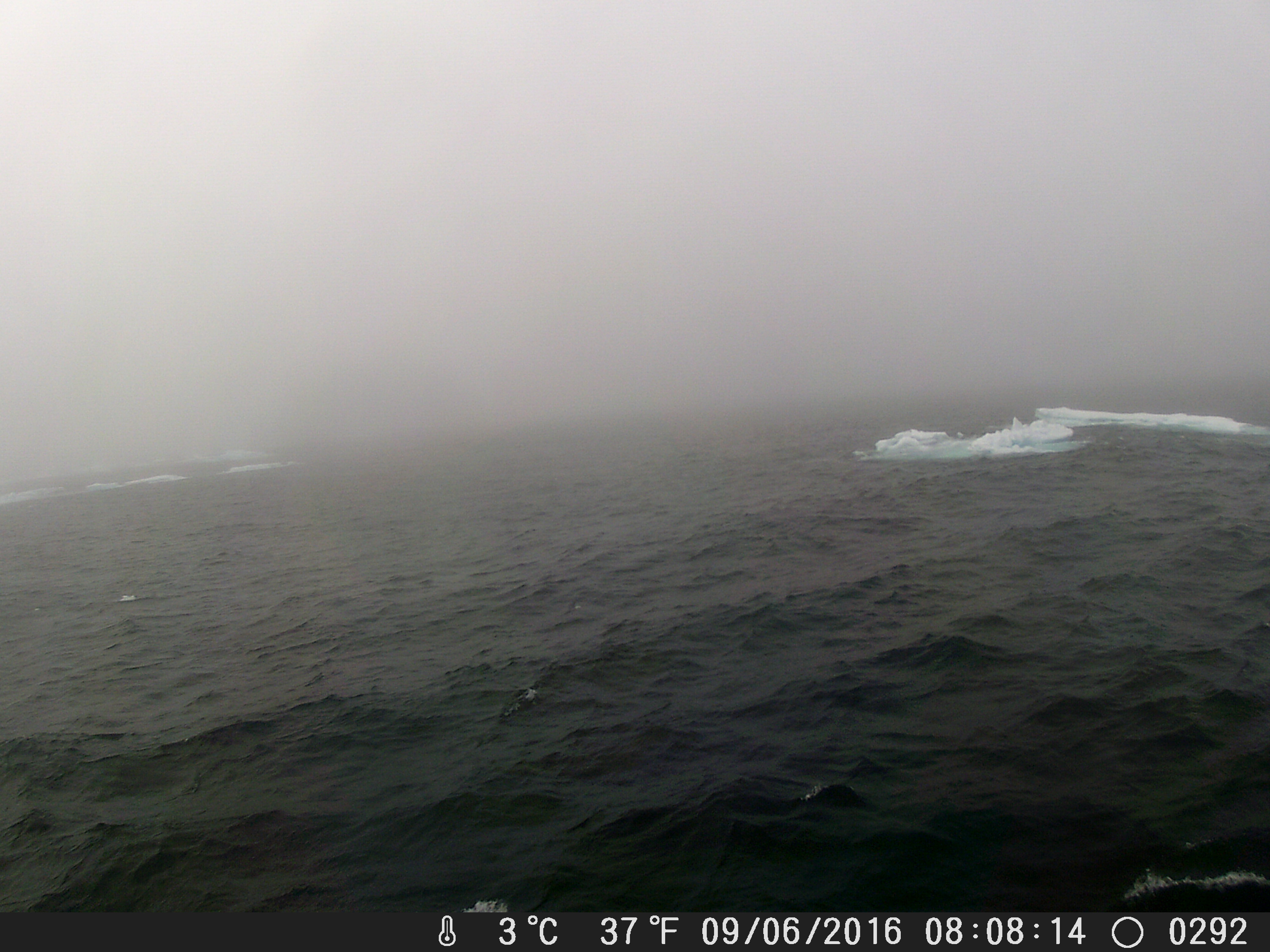 图5 格陵兰海海冰区海雾分布,(左)到达冰区外缘低空能见度良好,(中)继续航行约6km后到达海雾边缘,(右)自冰边缘向内航行大约15km后完全进入北极海雾雾区,能见度降低至500m一下。