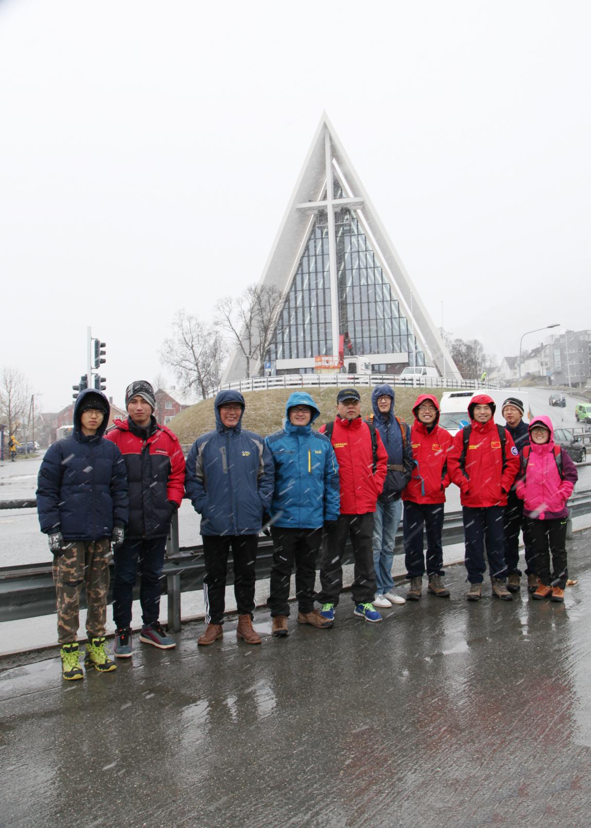 上图(鲁建林摄):考察队员于5月29日到达特罗姆瑟市,这座北极圈内的沿海小镇天气多变,在“盛夏”季节依然能够飘起鹅毛大雪。在起航准备阶段,受气旋影响,大雪断断续续,在晴朗多云的天气下仍会突然飘起雪花,幸运的是准备工作完毕后,气旋过境,天气转好,使得考察船能够在6月1日顺利起航。而19天的海上考察期间,气象条件总体都很温和,没有像以往几次遭遇大的低压系统,这也是本次考察能够非常顺利完成的一个重要因素。