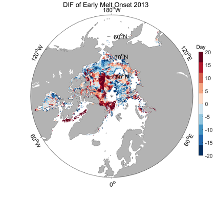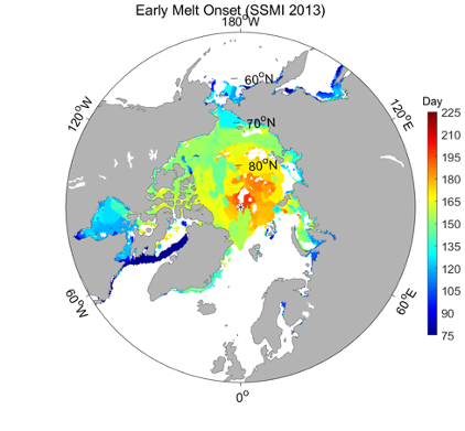 本年度北极海冰表面开始融化/冻结时间分布(12.5km)
