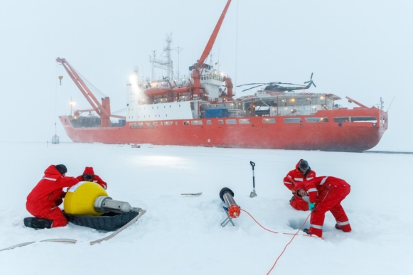 北极气候多学科漂流冰站观测计划(Multidisciplinary drifting Observatory for the Study of Arctic Climate, MOSAiC)是国际上酝酿和筹备了10年的大型国际计划,是迄今为止国际最大的北极科学考察计划,赵进平教授曾任该计划的中方代表。参加MOSAiC计划的有17个国家的300多名科学家,使用先进的科考设备对北冰洋中心区进行为期一年的连续观测,重点研究引起北极气候变化和受到北极气候变化影响的天气过程、海洋和海冰物理过程、生物地球化学循环过程和生物生态过程,以及各个过程之间的相互作用。该项目的实施一再推迟,最终于2019年9月20日在挪威特罗姆瑟正式启动。本项目在MOSAiC计划中布放5套冰基拖曳式海洋剖面浮标(Drift-Towing Ocean Profiler, D-TOP)。经过50多天的艰巨努力完成布放,顺利传输数据。