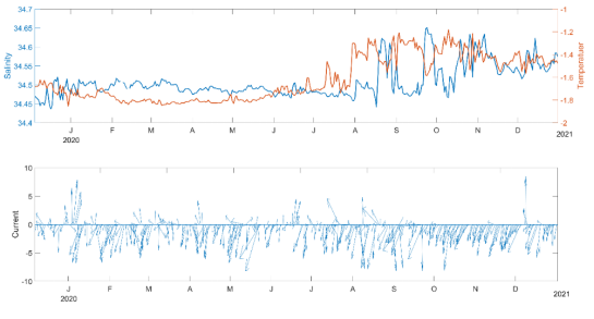本次考察,开云电竞网址在普里兹湾东侧的四女士浅滩成功回收300m以浅浅滩的潜标,发现在冬季8-12月份存在明显的暖水入侵信号,为分析普里兹湾区域冬季陆架的水动力过程,特别是陆架和大洋之间的水交换提供了数据支持。