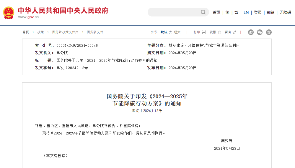 国务院关于印发《2024—2025年 节能降碳行动方案》的通知 国发〔2024〕12号