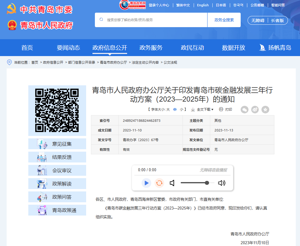 青岛市人民政府办公厅关于印发青岛市碳金融发展三年行动方案(2023—2025年)的通知