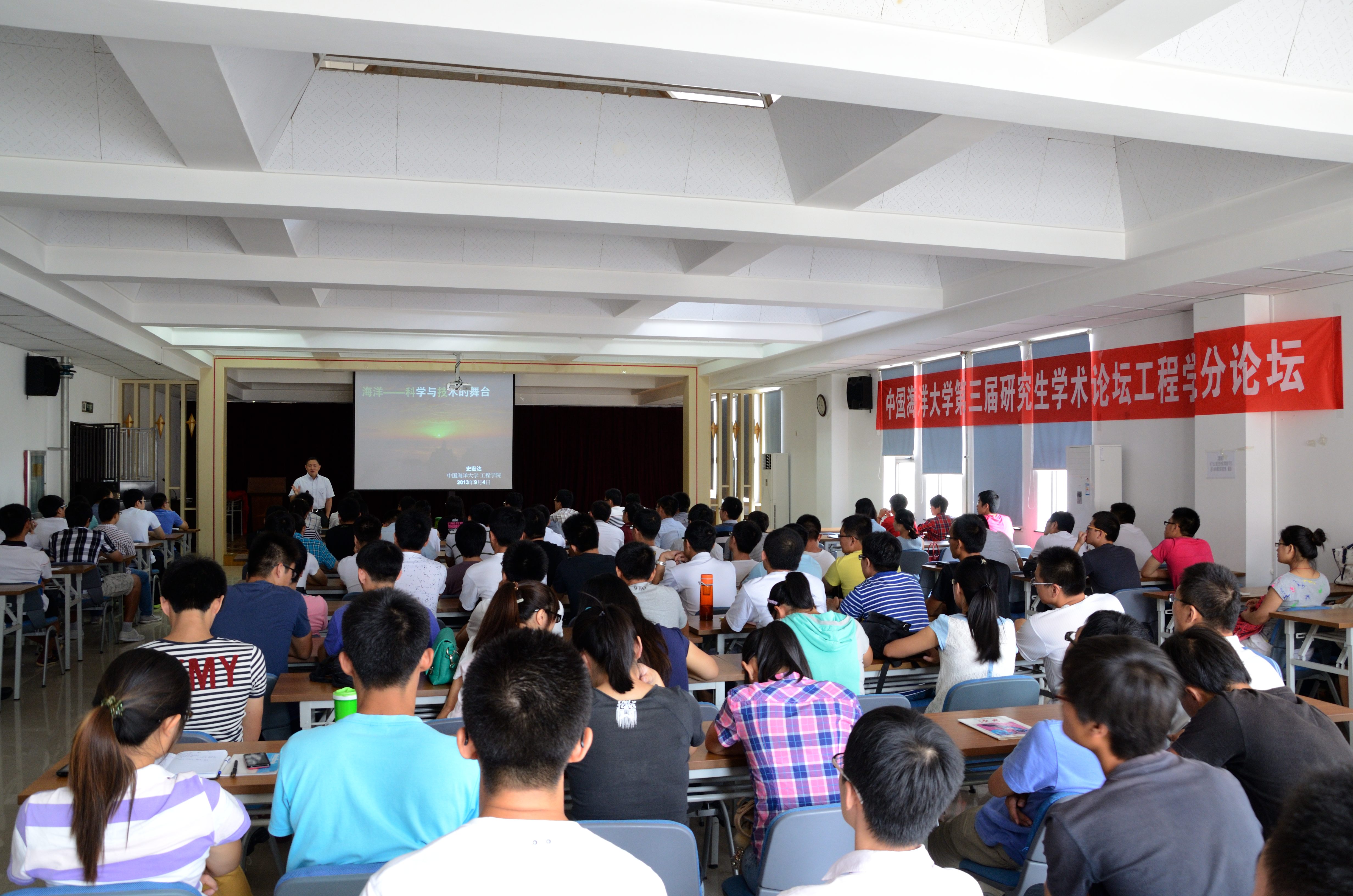 史宏达围绕“海洋——科学与技术的舞台”这一主题引经据典,从大到小,由浅入深。从“自然、地区、城市、未来的问题”到“世界、国家、自身的发展现状和发展方向”,提出了一个个现实而又发人深省的问题、难题和课题。同时从海陆关联工程、海岛开发与保护、海洋能源工程等方面向研究生同学阐明了海洋工程的巨大优势。他指出,工程的发展离不开科学的管理与规划,要做到顾全大局、高瞻远瞩、切实可行,同时强调发展工程要做到开发与保护并进,预防灾害发生,保护自然环境。幽默诙谐的语言让现场不时笑声阵阵,深刻现实的问题又不时让同学们陷入沉思。