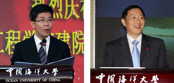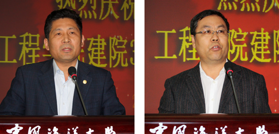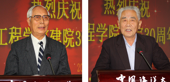 原海洋工程系第一任书记陈一鹤教授(左)、第一任系主任陈向荥教授在庆典大会上讲话