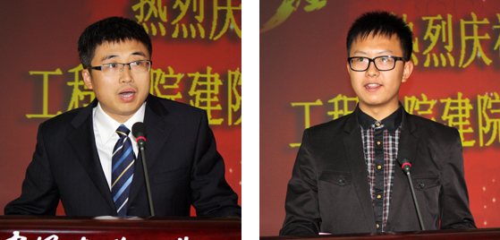 校友代表程方厚(左)、兄弟单位代表刘德进在庆典大会上发言