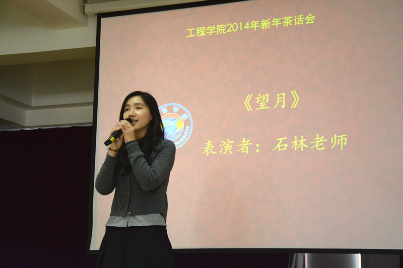 活动伊始,院长史宏达代表学院进行新年致辞。回顾院庆30周年,綦声波和焦双健分别带来了原创诗朗诵《贺工程学院建院30周年》和《沁园春·工院生日抒怀》,细数学院发展30年的风雨兼程,抒怀学院发展的卓越成就。接着,机电工程系石林带来歌曲《望月》,动听的旋律将茶话会慢慢带入佳境。
