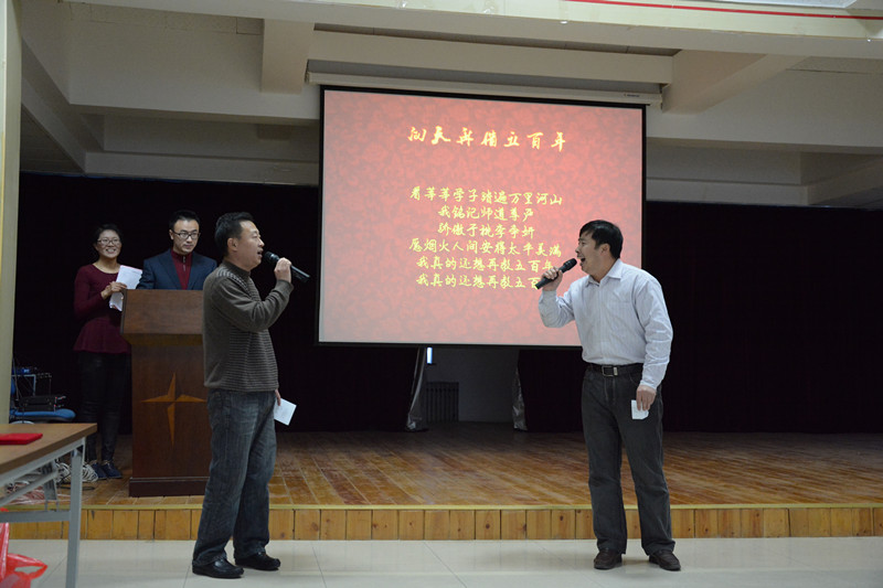 节目最后,学院团委钟媛、关鹏、高辉、陈兴旺带来《年代秀歌曲串烧》,用《希望》、《迟到》、《快乐老家》、《春天花会开》等经典老歌分别献唱学院50后、60后、70后、80后教师,最后合唱改编歌曲《大工程》,“我们都有一个家,名字叫工程”,在欢快的氛围中将现场气氛推向高潮。
