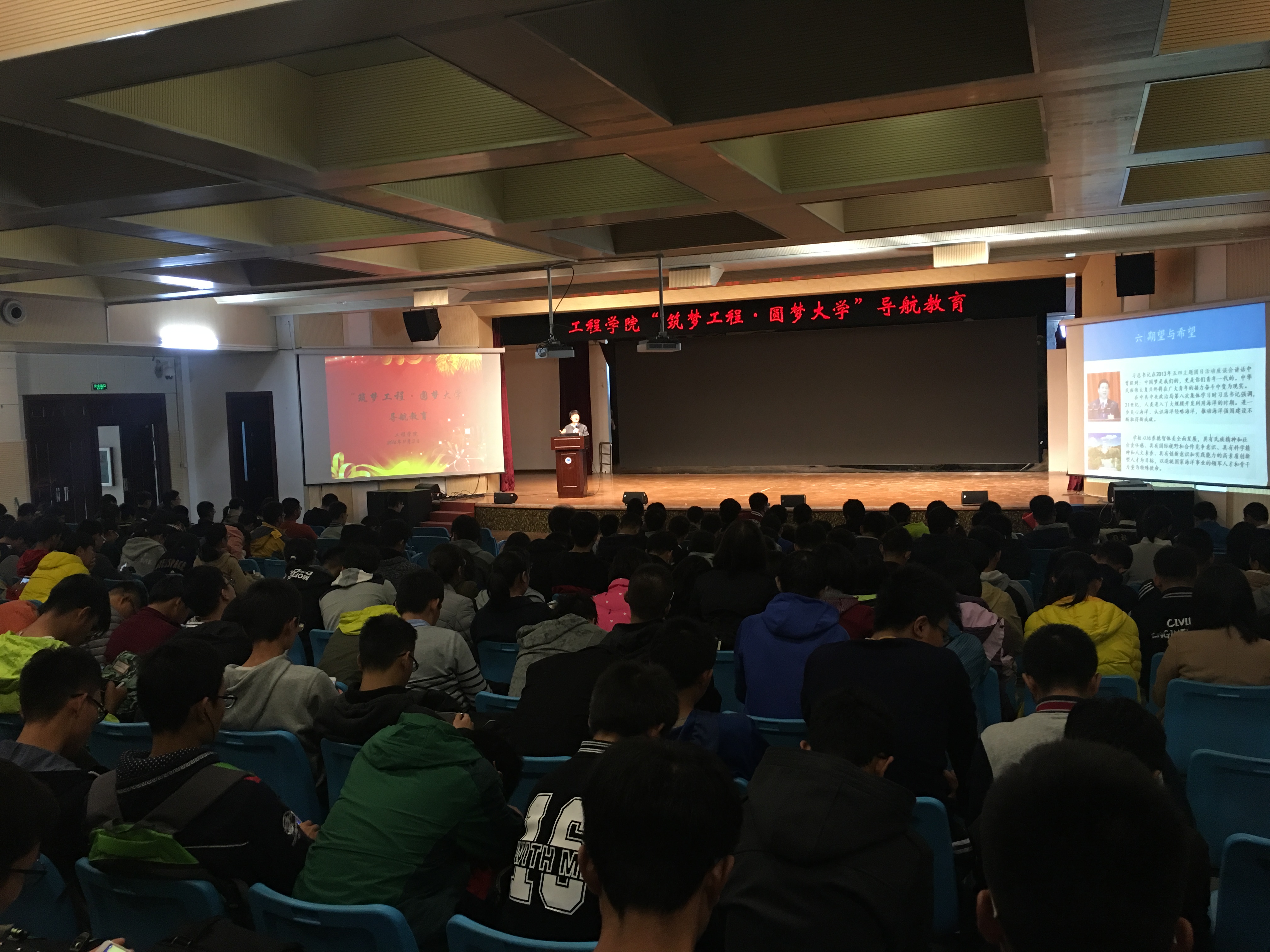 11月3日下午,工程学院“筑梦工程·圆梦大学”导航教育在大学生活动中心多功能演播厅成功举行。工程学院党委副书记于静、团委钟媛、优秀学生代表出席活动,工程学院2016级全体新生参加教育。