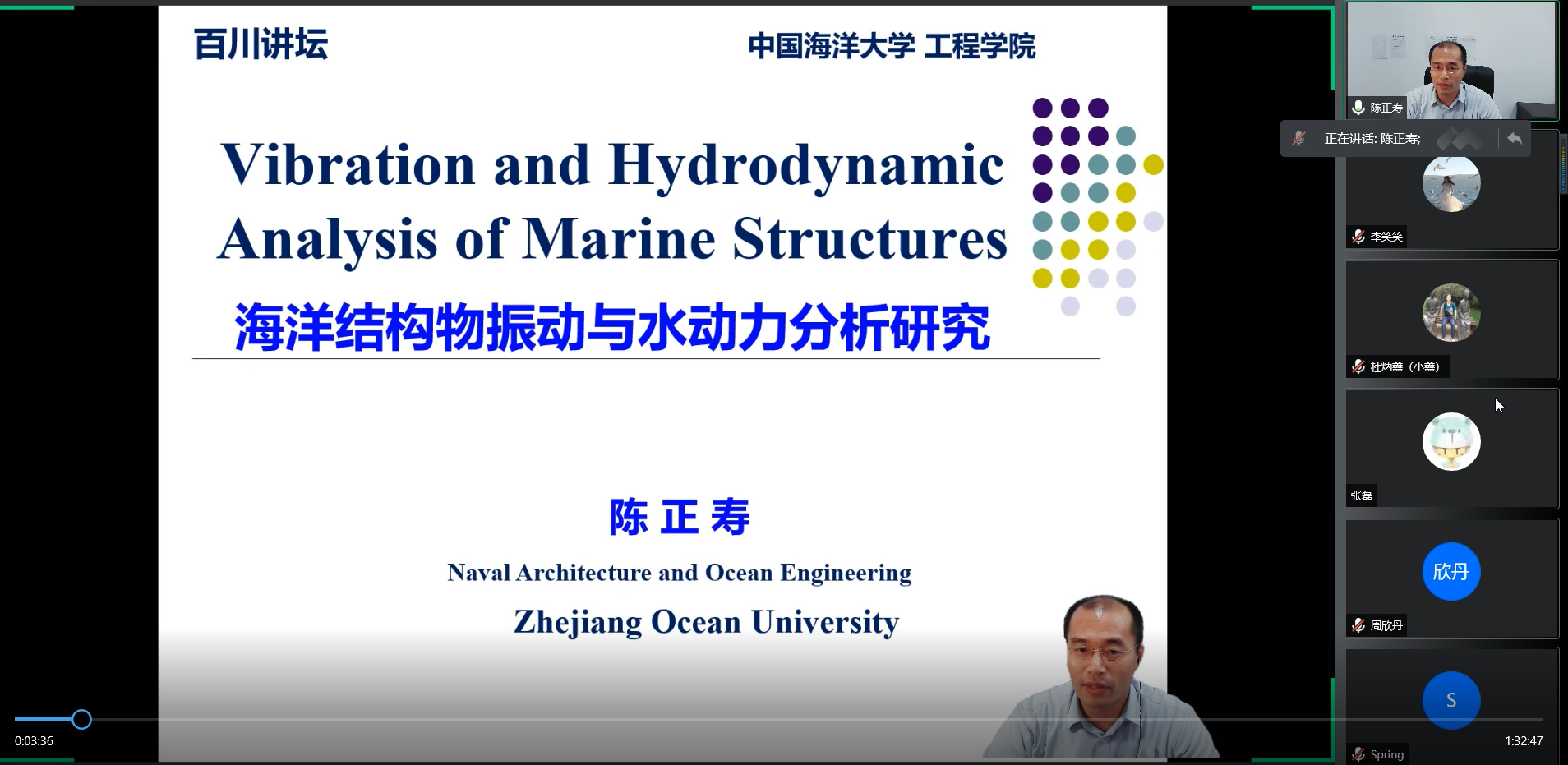 (本站讯)3月25日晚,浙江海洋大学船舶与海运学院陈正寿教授做客海大“研究生百川讲坛”,为我们带来主题为“海洋结构物振动与水动力分析研究”的精彩报告。此次报告由开云电竞网址研究生院、开云电竞网址工程学院联合主办。讲座由工程学院赵林副教授主持沙龙,工程学院郑中强老师及50多位师生通过腾讯会议平台参与此次讲座。