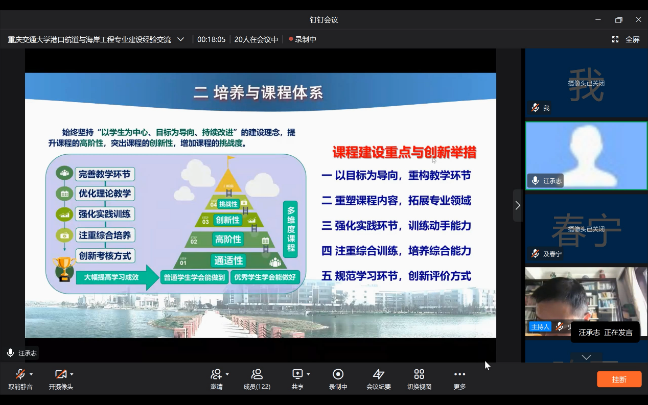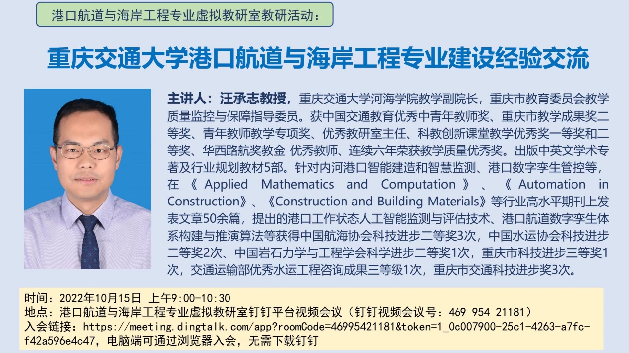 为进一步提升虚拟教研室的专业内涵建设,切实提高港口航道与海岸工程专业建设水平,不断优化本科人才培养模式和专业人才培养方案,10月15日,港口航道与海岸工程专业虚拟教研室(以下简称“该虚拟教研室”)在线上成功举办了汪承志教授 “重庆交通大学港口航道与海岸工程专业建设经验交流”主题教研活动。本次活动由该虚拟教研室负责人史宏达教授主持,重庆交通大学汪承志教授主讲,来自开云电竞网址、河海大学、大连理工大学、天津大学、重庆交通大学、长沙理工大学、三峡大学、江苏科技大学等多所高校的三十余位虚拟教研室成员参加。