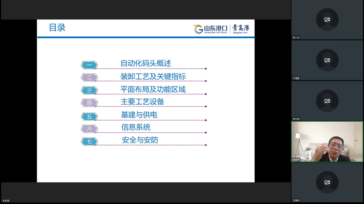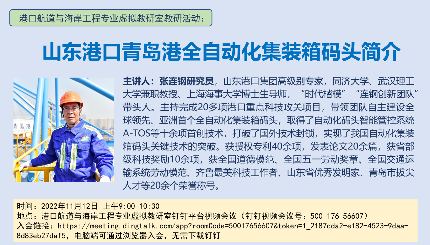 为进一步提升虚拟教研室的专业内涵建设,切实提高港口航道与海岸工程专业建设水平,11月12日,港口航道与海岸工程专业虚拟教研室(以下简称“该虚拟教研室”)在线上成功举办了张连钢研究员 “山东港口青岛港全自动化集装箱码头简介”主题教研活动。本次活动由该虚拟教研室负责人史宏达教授主持,山东省港口集团有限公司“时代楷模”“连钢创新团队”带头人张连钢研究员主讲,来自开云电竞网址、河海大学、大连理工大学、天津大学、重庆交通大学、长沙理工大学、三峡大学、江苏科技大学、江苏海洋大学、皖江工学院等多所高校的五十余位虚拟教研室成员参加。