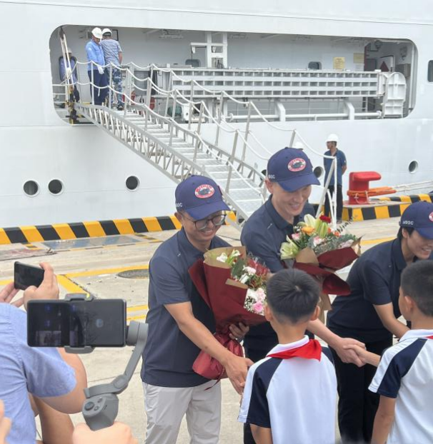 少先队员向出发的科考队员们送上鲜花(陈旭光后排左1)