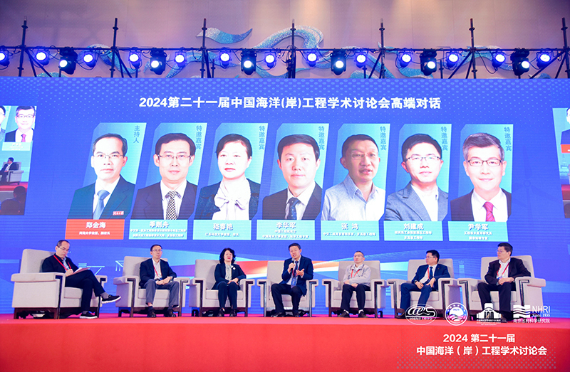 高端对话由河海大学副校长郑金海主持。李华军、张鸿、嵇春艳、招商工业总工刘建成、中交第一航务工程勘察设计院总工季则舟、青岛科而泰公司总经理尹学军共同就“高端海洋装备如何推动新质生产力发展”话题进行深入探讨。