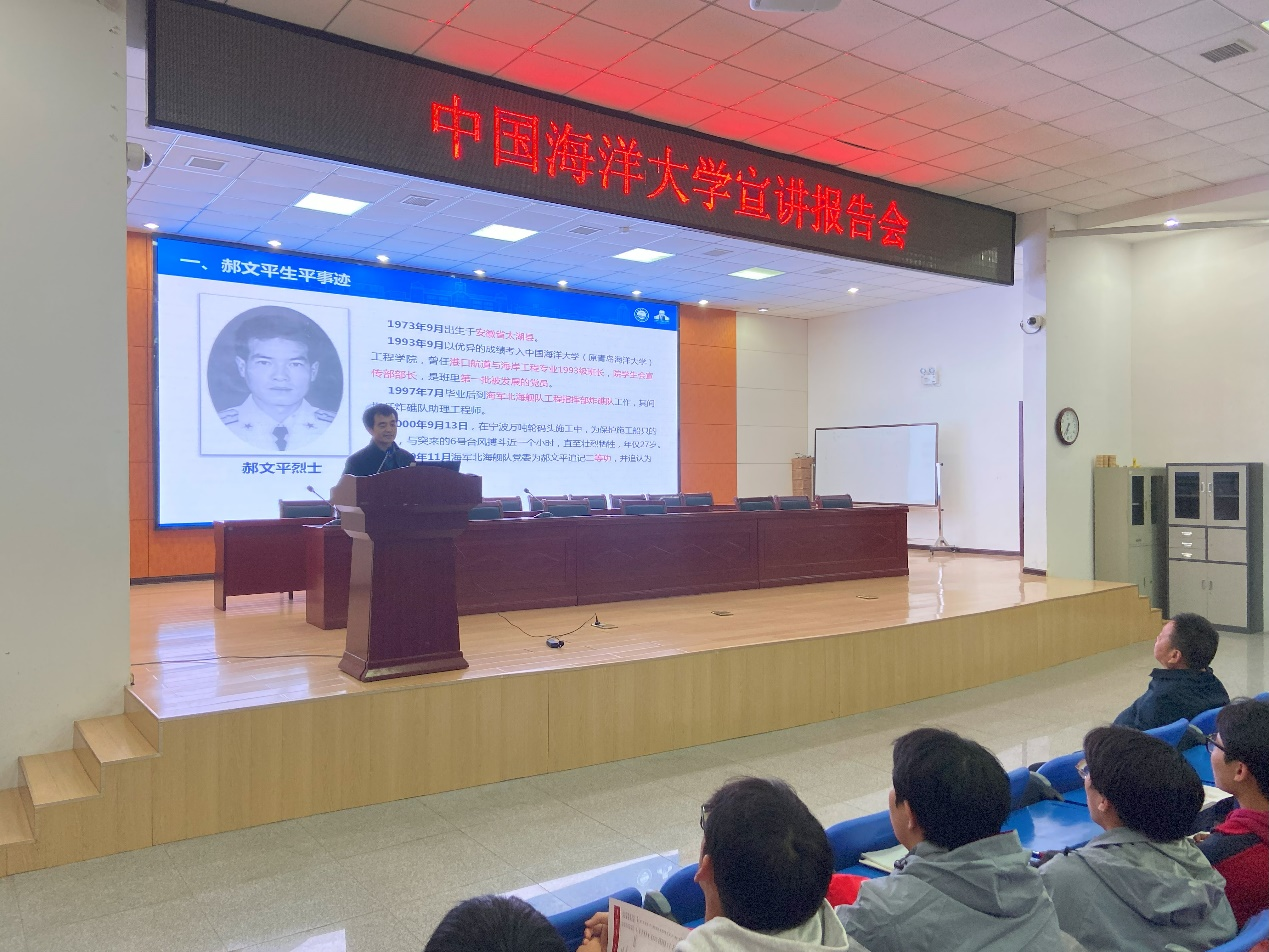 安徽省太湖中学是工程学院优秀校友郝文平烈士的高中母校,梁丙臣详细介绍了郝文平烈士的生平及先进事迹,将思政教育融入专题讲座,号召广大学子以郝文平烈士为榜样,志存高远,奉献社会,强化学生海洋意识和责任感,鼓励学生积极投身于建设海洋强国的壮丽事业当中。