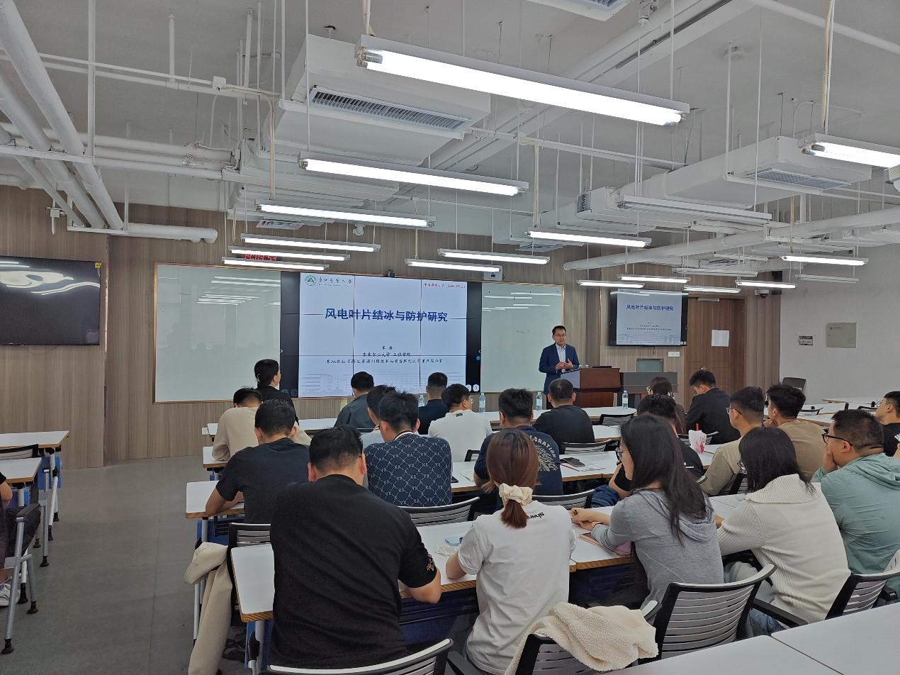 报告中李岩教授特别强调了海上风电结冰研究的特殊性与严峻性。海上风电所处的高湿度、强盐雾海洋环境,使得叶片结冰速度更快,冰层含盐量高、结构更为复杂,不仅加剧气动性能下降和结构损伤风险,还会因盐蚀作用加速叶片材料老化。李岩教授介绍了团队针对含盐含沙湿空气在风电叶片结冰的相关研究进展和未来规划。在交流环节,现场师生就防冰涂层的耐久性、除冰系统的能耗优化等实际工程问题与李岩教授展开了热烈讨论。