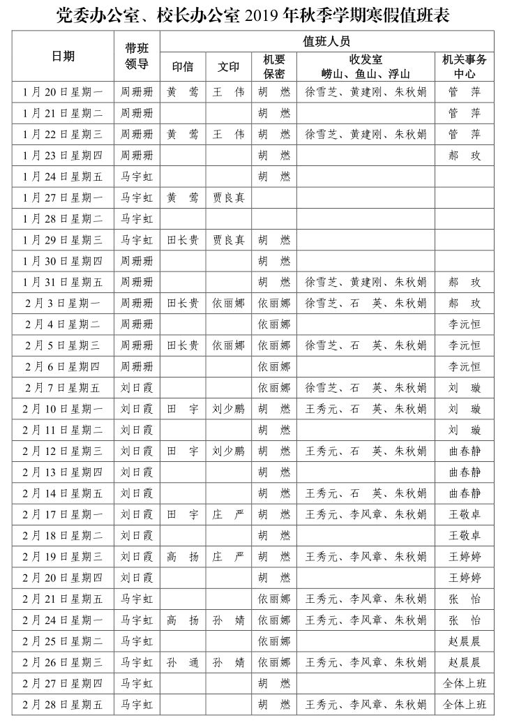 根据学校《关于做好2019年秋季学期寒假期间有关工作的通知》要求,为做好假期工作,现将党委办公室、校长办公室相关工作安排如下: