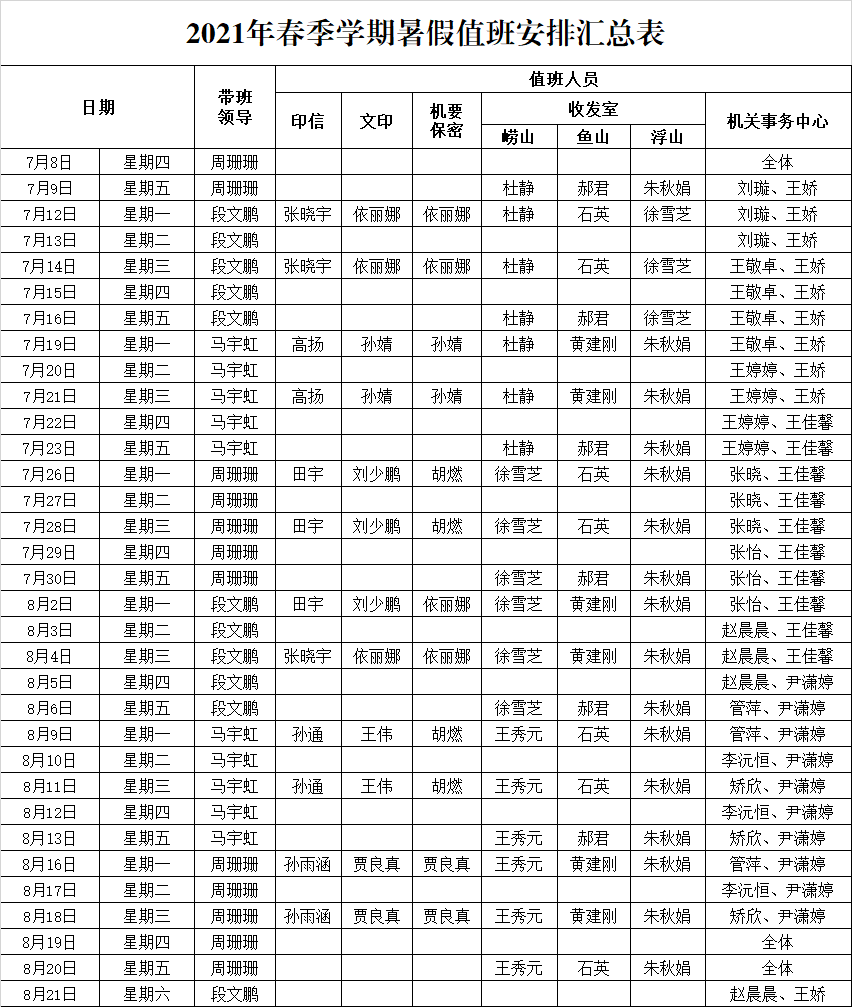 附件:2021年春季学期暑假值班安排汇总表