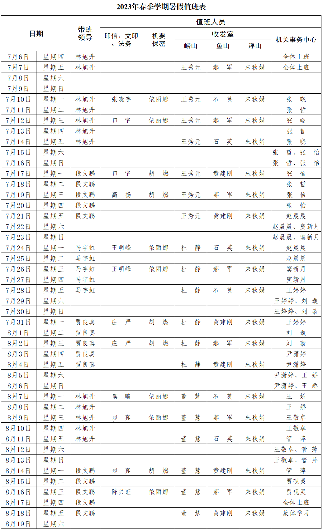 附件:2023年春季学期暑假值班表