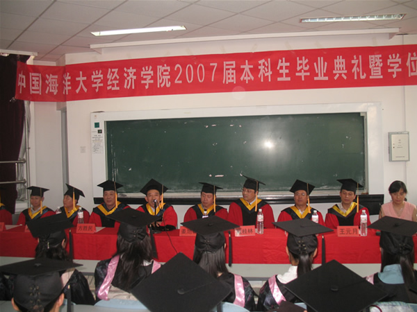6月25日下午,经济学院2007届本科生毕业典礼暨学位授予仪式在浮山校区X305教室隆重举行。校党委副书记李耀臻教授和经济学院党总支方胜民书记、院长姜旭朝教授、副院长戴桂林教授和赵昕教授、国际经济与贸易系主任高金田教授、金融系主任殷克东教授、经济学系主任王元月教授、国际经济与贸易系副主任邵桂兰教授及团总支老师、毕业生班主任和全体毕业生们参加了本次仪式。仪式由经济学院党总支副书记于淑华主持。
