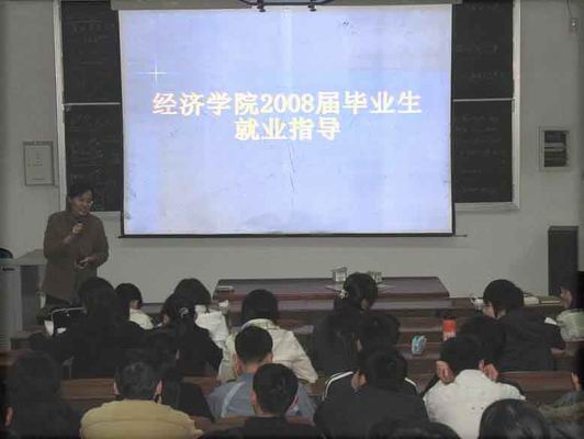 11月21日晚上6:00,经济学院2008届毕业生就业指导讲座在E104教室举行。于淑华副书记在讲座中就海大经济学院本科生所面临的就业形势进行了客观的分析,强调了提前做好就业准备的重要性以及在就业过程中所应该注意的问题。最后,于书记向学生传授了一些投简历及面试中的技巧问题。