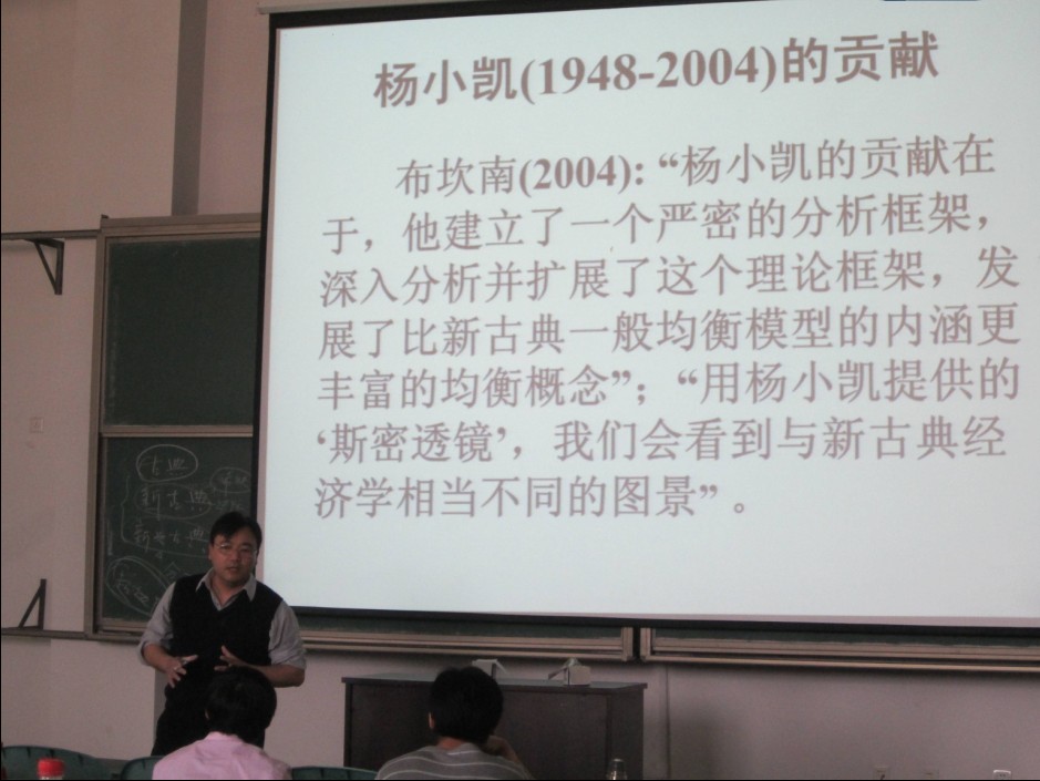 主持人首先向大家介绍庞春教授的相关信息,庞教授师从曾两次获得诺贝尔经济学奖提名的著名经济学家杨小凯。在大家热烈的掌声下庞春教授开始了其极富个人特色的演讲。本次讲座内容共分为四个方面:首先,庞教授对经济学的学科体系进行分析,重点指出中外经济学学科体系上的不同。与国内经济学复杂学科分类不同的是,国外对于经济学的研究主要分为三部分,包括理论研究、经验研究以及政策分析,而在研究方法方面,庞教授表示对弗里德曼“实证与规范经济学”分类的赞赏,并以此引出本次演讲的对象——新兴古典经济学;其次,通过提问的方式与学生互动,比较古典经济学、新古典经济学以及新兴古典经济学在研究对象以及研究方法上的不同;第三,通过铁—锄头—粮食分析如何获得粮食这一简单生动的例子,引出经济活动如何组织等深层次的问题;最后,庞教授留出了充足的答疑时间,并且鼓励在座同学积极提问。