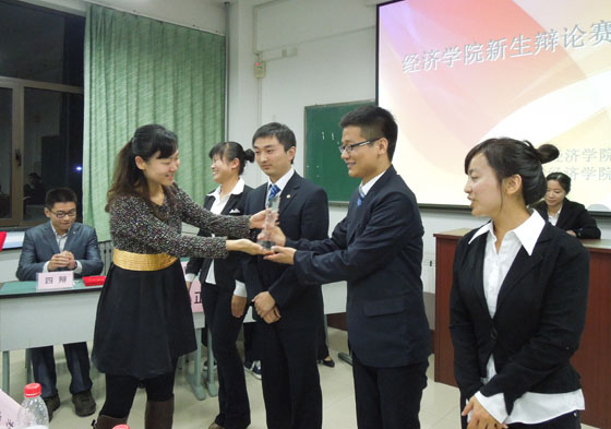 本站讯 11月1日,由经济学院研究生会主办的经济学院2012级研究生辩论赛决赛准时拉开帷幕。本次辩论赛决赛的正反双方分别是2012级国际贸易班与2012级金融班,双方就“人生路上应乘胜追击还是应见好就收”各抒己见,最终反方金融班凭借机智的回答和灵活的应变成为本届经济学院研究生辩论赛冠军,正方四辩戴国平获得本场比赛“最佳辩手”称号。