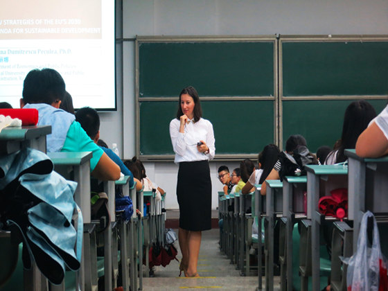 首先,Adelina教授从经济全球化的大背景出发,讲解了欧盟的发展及其运作。在谈到欧盟2030年可持续发展议程的新战略时,她又深入分析了欧盟可持续发展的目标和议程,并以罗马尼亚为例介绍了加入欧盟需满足的条件及发展路径。在谈到贸易与经济以及英国脱欧的成本与影响等问题时,她与多名同学进行了互动,希望大家对相关热点进行更深入的研究。同时,她又提到自己对中国传统文化的喜爱,也介绍了学院与她所在学校的交流项目,并鼓励有兴趣的同学参加。