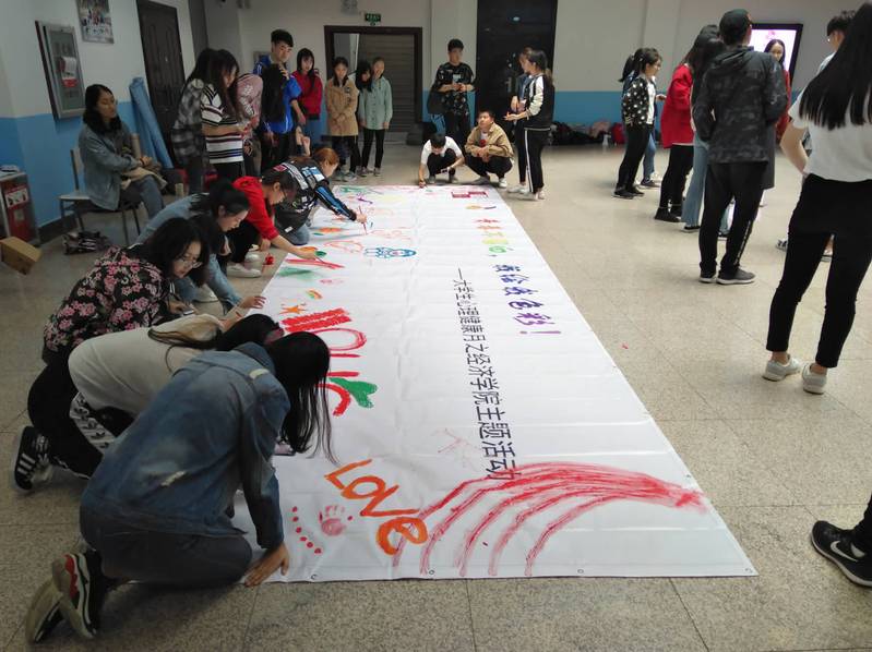 本次活动由经济学院自强社承办,经济学院学生会协办。活动开始前,工作人员做了充足的准备工作。他们将一张巨大的白底喷绘和十几种颜料以及多只笔等物资提前带到活动地点,然后早早地开始为活动的开展做准备。为方便其他同学直接绘画,他们提前调好了红、橙、黄、蓝、紫、粉等多种不同颜色的颜料。