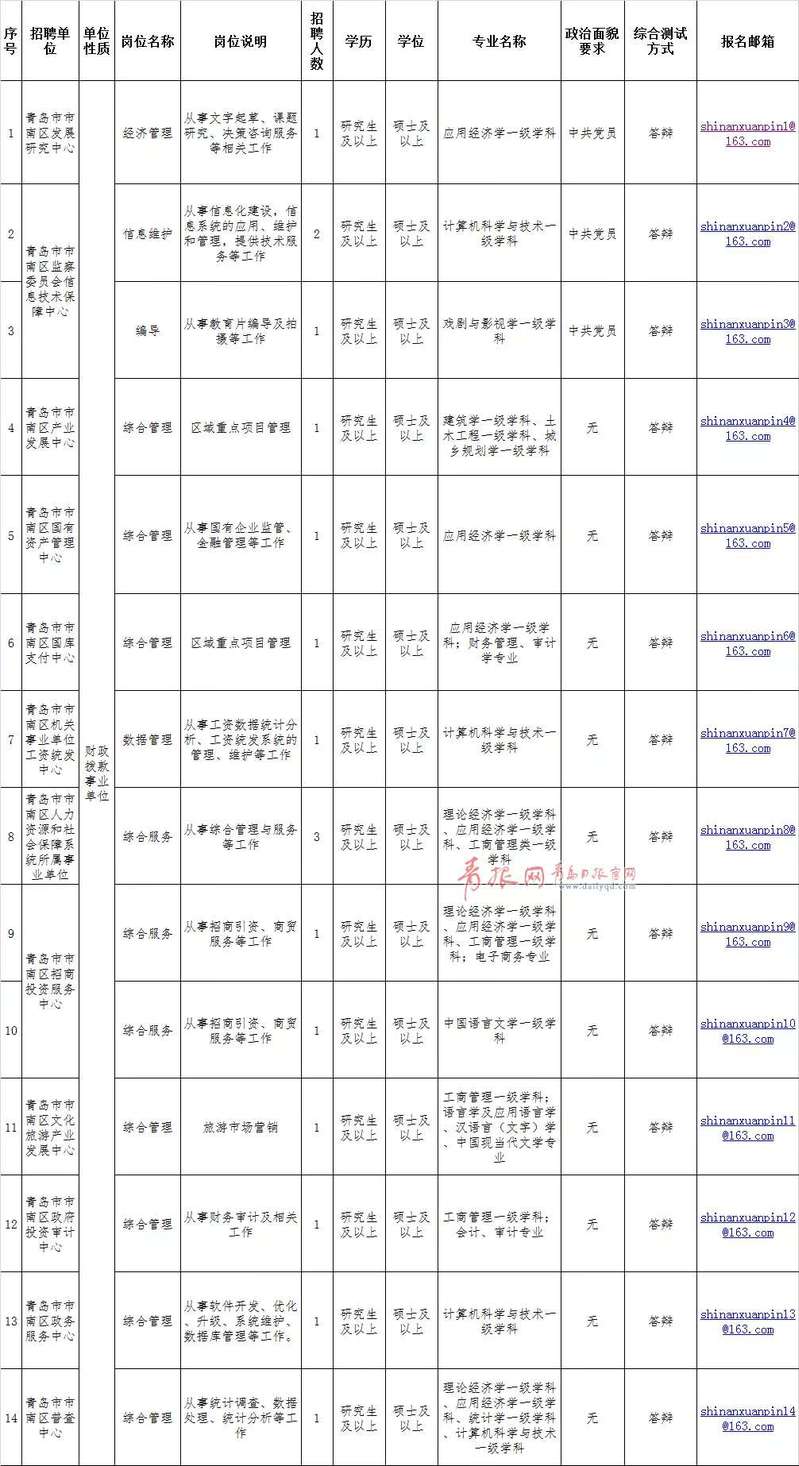 因篇幅有限,个别内容并未显示,有需求的求职者可登录青岛市市南区政务网相关页面查看完整招聘计划表。