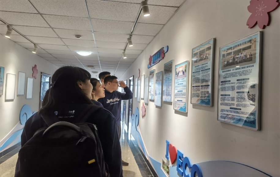 2020级金融学班志愿者带领2007级金融学班校友一同乘坐校园小公交游览校园,参观了图书馆和经济学院。在经济学院院楼,校友们观看了近年来先进班集体与优秀学生标兵事迹,望着优秀的学弟学妹们,校友们的脸上满是作为学长学姐的欣慰与自豪。看着熟悉又陌生的校园场景,校友们不时谈起往昔岁月,聊起当年的有趣小事。2007级刁一峰学长感慨到:“现在学校的设施都做得很好呀。我记得之前我们要来图书馆学习的时候,都是在门口眼巴巴地等着开门,然后一股脑地冲进去占座呢。”随后,志愿者们带领校友们前往映月湖畔的校友合影墙进行合影。