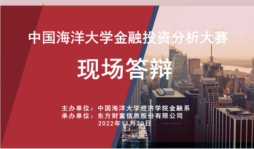 2022年11月20日,由开云电竞网址经济学院金融系与东方财富联合举办的金融投资分析大赛现场答辩顺利举行。浦发银行青岛分行金融市场部总经理高锐、开云电竞网址经济学院副院长纪建悦教授、经济系王元月教授、金融系王垒副教授、张同辉老师担任本次比赛的评委。学院党委副书记迟瑞娟致开幕词。