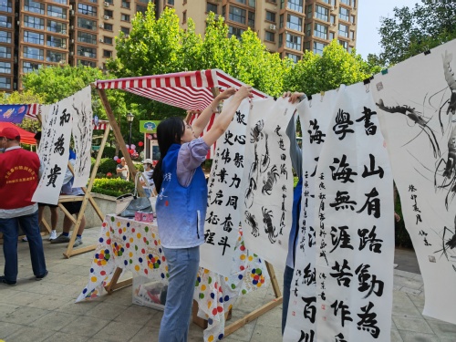 在启动仪式后,社区居民带来了舞蹈、武术等多种形式的精彩表演,为现场观众带来了一场“文化盛宴”。与此同时,阅读文化市集也如火如荼地进行,图书义卖、图书置换、“万物复书”、诗词大会、非遗体验、书画展示及汉服体验打卡等活动精彩纷呈,吸引了社区诸多居民参与其中。期间,22物流研党支部志愿者提前进行了场地布置、物资搬运等准备工作,并在阅读文化市集活动中按照既定的分工进行服务,积极引导现场居民体验各类项目。活动现场热闹非凡,志愿者们热情服务的身影也成为了一道靓丽的风景线。