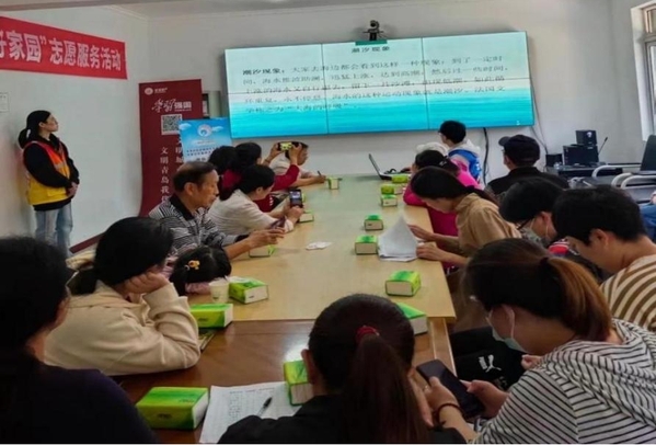 活动之初,志愿者邱鑫为社区中老年人介绍“我们的海洋”,通过介绍黄海引入,阐述了海洋对生态的重要性及其当下所面临的种种威胁。通过对常见海洋现象的介绍,包括潮汐、海市蜃楼、蓝洞、珊瑚礁等,展示了海洋多样性的一面。通过海洋灾害及成因的讲解,引发了听众对海洋保护的思考。在讲解过程中,搭配生动的图片和科学的讲解视频,为听众带来了一场通俗易懂的海洋知识课堂。在邱鑫的讲解过程中,现场社区居民纷纷利用手机、笔记本等记录下讲解的内容,并就自己对海洋灾害的看法和体会进行讨论。