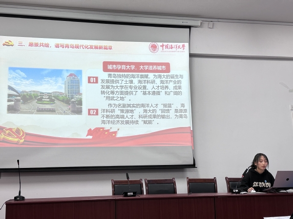 活动中,宣讲团成员孙晓琪同学从理论逻辑、历史逻辑、时间逻辑三个层面讲述了中国式现代化的五大特征、新时代青岛发展的巨大成就以及青岛发展的未来展望,为我们呈现了新时代以来青岛勇担时代使命、不断开创社会发展的新局面,奋力谱写新时代社会主义现代化国际大都市的新篇章。