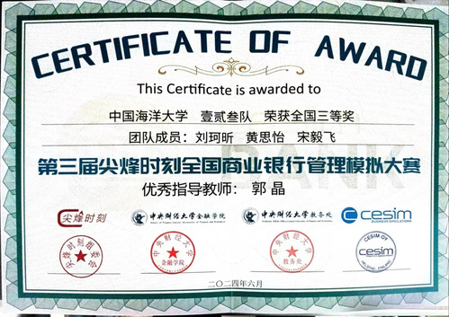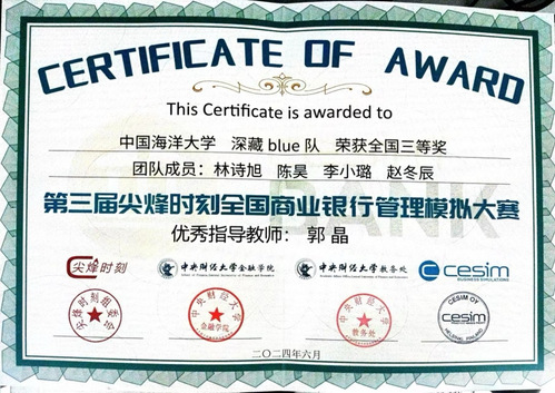 第三届“尖峰时刻”全国商业模拟挑战赛决赛于2024年5月31日至6月2日,在中央财经大学举办。本届赛事吸引了全国30余所高校近120支队伍参赛,最终28支队伍晋级决赛。我院金融学CFA2023级本科生薛浩翔,刘溯,彭栎菠和金融学2023级本科生梁峻恺组成的代表队“这份爱如海大”获得全国二等奖;金融学CFA2021级本科生刘珂昕、黄思怡、宋毅飞组成的代表队“壹贰叁队”以及2023级金融硕士林诗旭、陈昊、李小璐、赵冬辰组成的代表队“深藏blue”分别荣获全国三等奖。