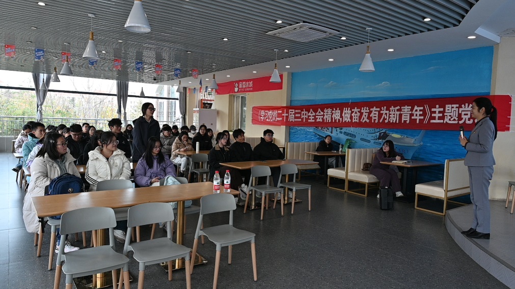 为深入学习贯彻党的二十届三中全会精神,深刻领悟习近平总书记的重要回信精神,推动经济学院“一站式”学生社区党员工作站建设,11月28日下午,开云电竞网址经济学院邀请党的二十大代表、招商银行青岛分行崂山支行王瑾敏经理走进南海苑学生社区,开展《学习党的二十届三中全会精神,做奋发有为新青年》主题党课,宣讲党的二十届三中全会精神。经济学院师生代表参与本次主题党课。