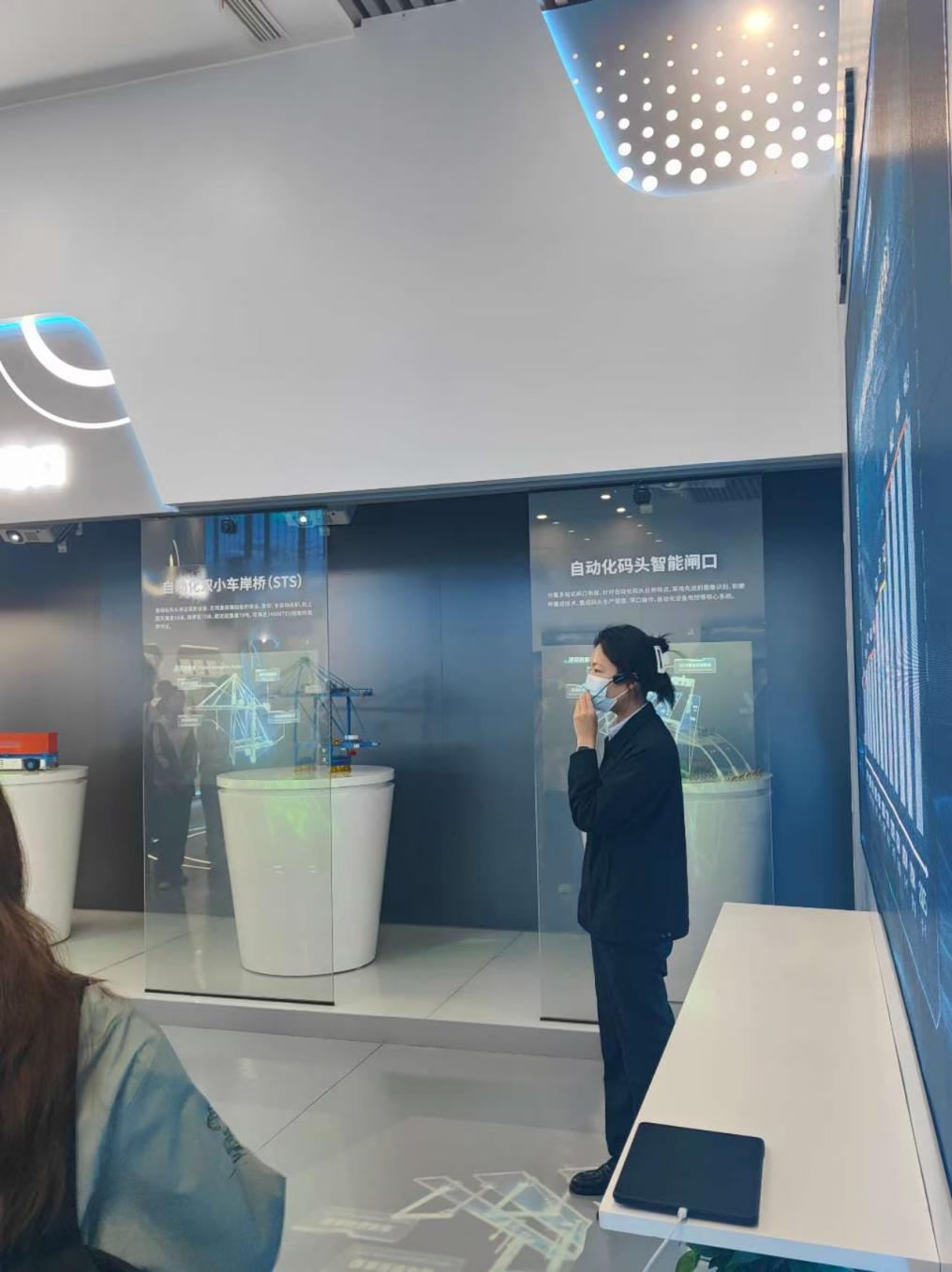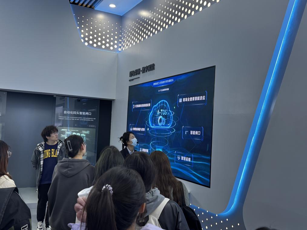 登上展馆三楼,师生集体观看了青岛港全景宣传片。影片以宏大的视角呈现了青岛港从百年老港到全球首个“氢+5G”智慧生态码头的转型之路,重点解析了港口在RCEP框架下的物流网络布局以及临港产业集群的经济辐射效应。过去在课堂讨论港口经济‘流量变现’理论时总觉得抽象,今天看到青岛港集装箱航线密度、腹地经济联动等数据,才真正理解何为‘以港兴城、港城共荣’。”