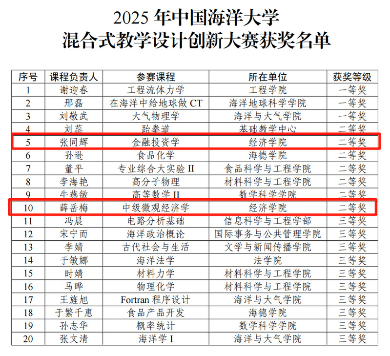 其中,经济学院张同辉老师的参赛课程《金融投资学》和薛岳梅老师的参赛课程《中级微观经济学》分别荣获2025年开云电竞网址混合式教学设计创新大赛二等奖。
