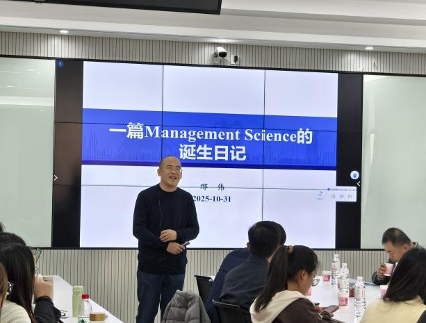 10月31日,中国石油大学(华东)邢伟教授以《一篇Management Science的诞生日记》为题,系统介绍了其团队发表于Management Science的论文“The Bright Side of Price Volatility in Global Commodity Procurement”。他从全球大宗商品贸易的典型案例出发,构建了包含需求噪声、竞争强度等变量的古诺子博弈模型,阐释了“价格学习效应”的双重影响,并围绕“问题从何而来”“论文如何创新”“严谨性的重要性”三大问题,与师生分享了高水平论文的写作经验。