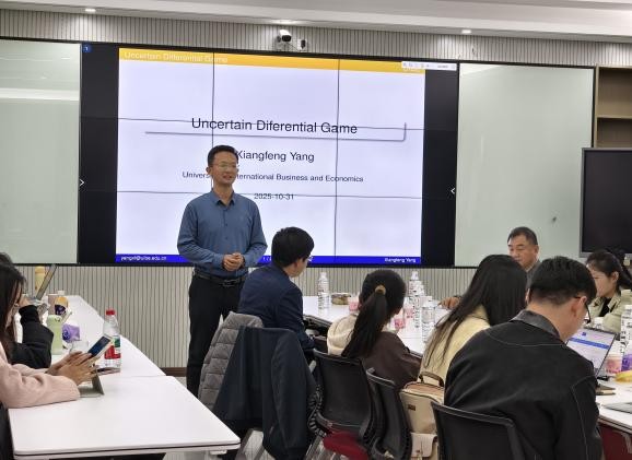 对外经济贸易大学杨向峰教授作了题为“Uncertain Differential Game”的学术报告。他从博弈论基础概念入手,系统梳理了不确定微分博弈的发展脉络,重点分析了反馈纳什均衡、合作博弈等核心理论,并结合双寡头广告策略与哥斯达黎加运营商实例,展示了理论模型在真实场景中的应用价值。