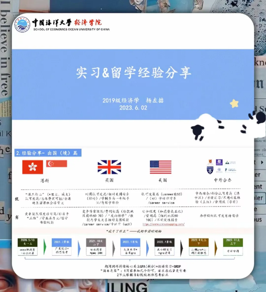 随后,杨左喆同学从如何选择院校、如何进行时间规划等方面分享了自己的出国留学申请过程以及经验。从大一上学期到大三下学期,杨左喆同学都一直在积极参加创业竞赛、申请实习实践、进行语言学习,对计划出国留学的同学提供了时间线上的经验借鉴,帮助大家更好地了解留学相关信息和流程,做出合理的决策与规划。