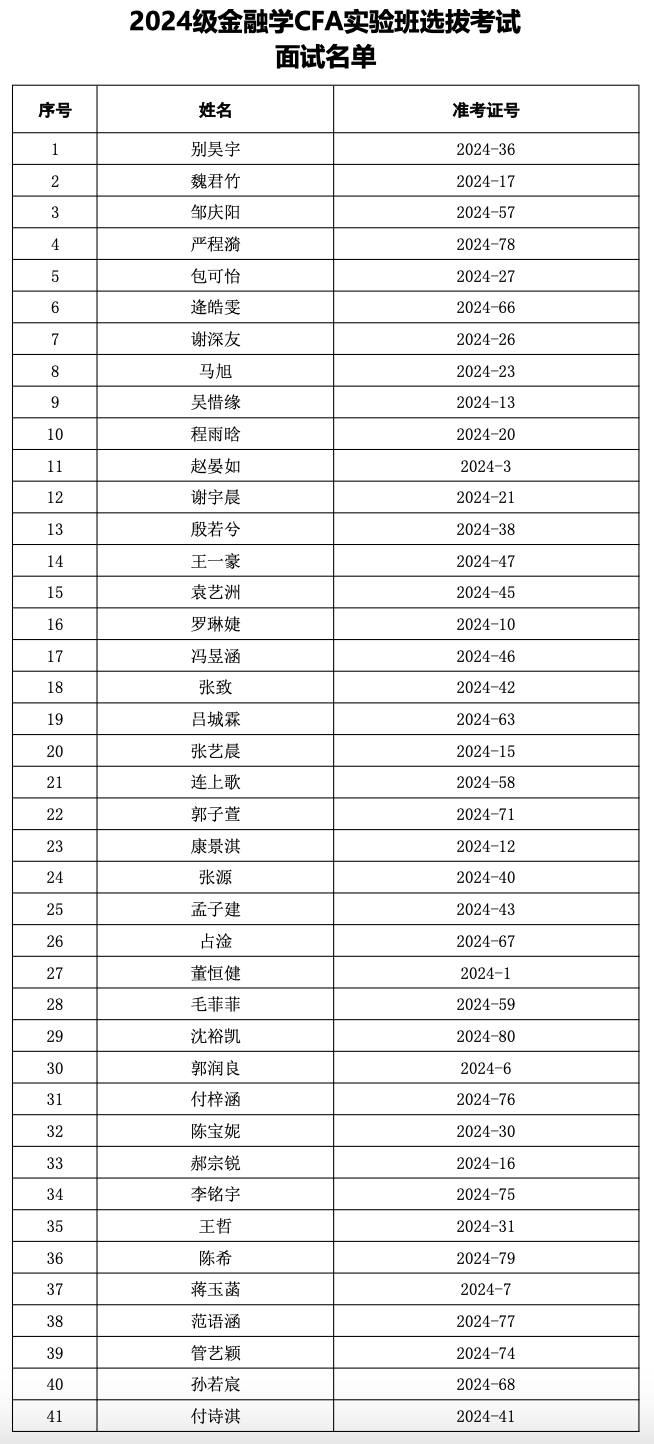 根据《开云电竞网址2024级金融学CFA实验班选拔通知》安排,经济学院对申报金融学CFA实验班的学生进行了笔试考核,以下41名同学具有面试资格。