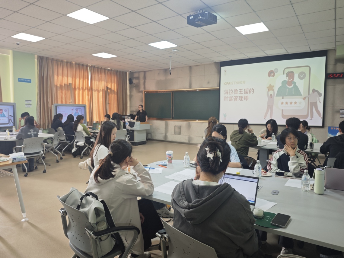 2025 年 5 月 15 日,CFA 财富配置实操体验营活动成功举办。此次体验营由 CFA 持证人亲自带领,以模拟财富配置为核心,吸引了众多对财富管理感兴趣的学生参与,活动通过理论讲解与实战演练相结合的方式,为学生带来了一场沉浸式的财富管理学习体验。