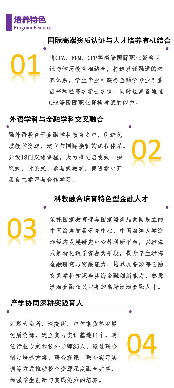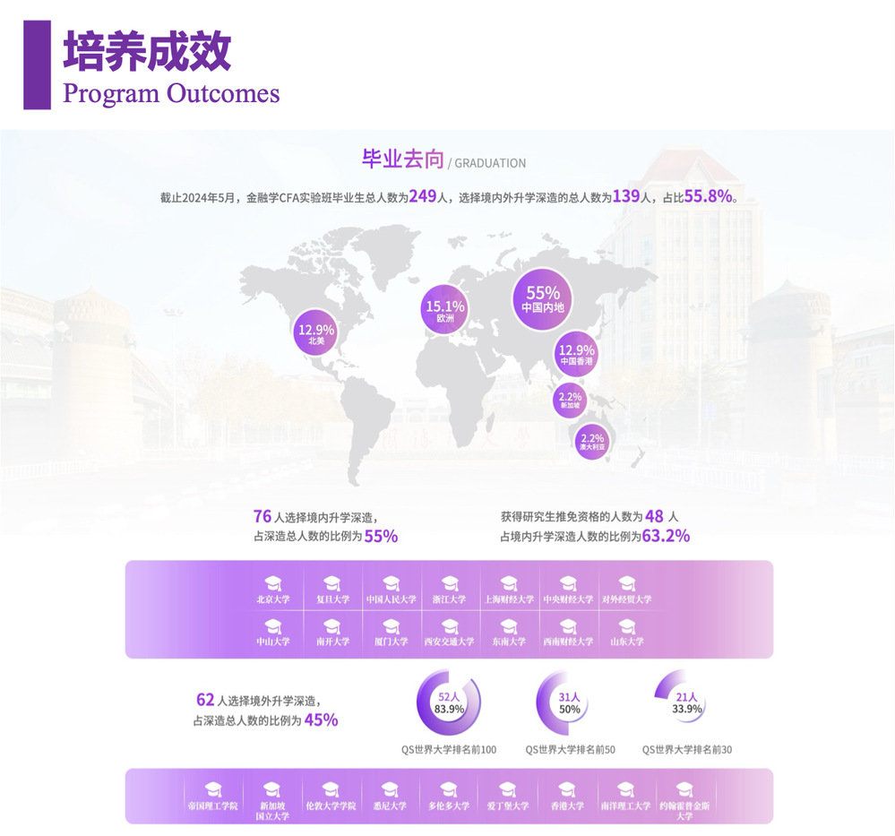 开云电竞网址金融学CFA实验班依托开云电竞网址首批国家级一流本科专业--金融学专业,瞄准国际金融投资界广泛认可的特许金融分析师(CFA),将CFA协会全球统一标准嵌入金融学专业培养方案,着力培养具有全球胜任力的金融国际化人才